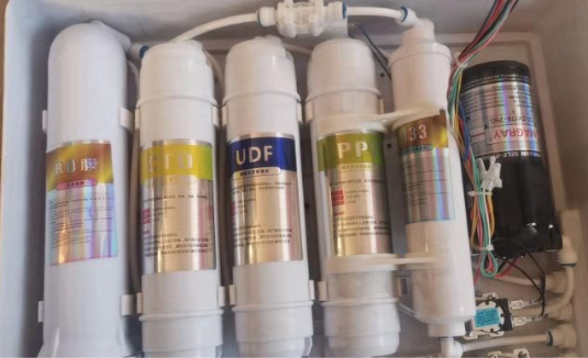 1)、第一級過濾:5微米PP纖維濾芯(去除水中肉眼可見雜質,包括泥沙、紅蟲、鐵銹等)